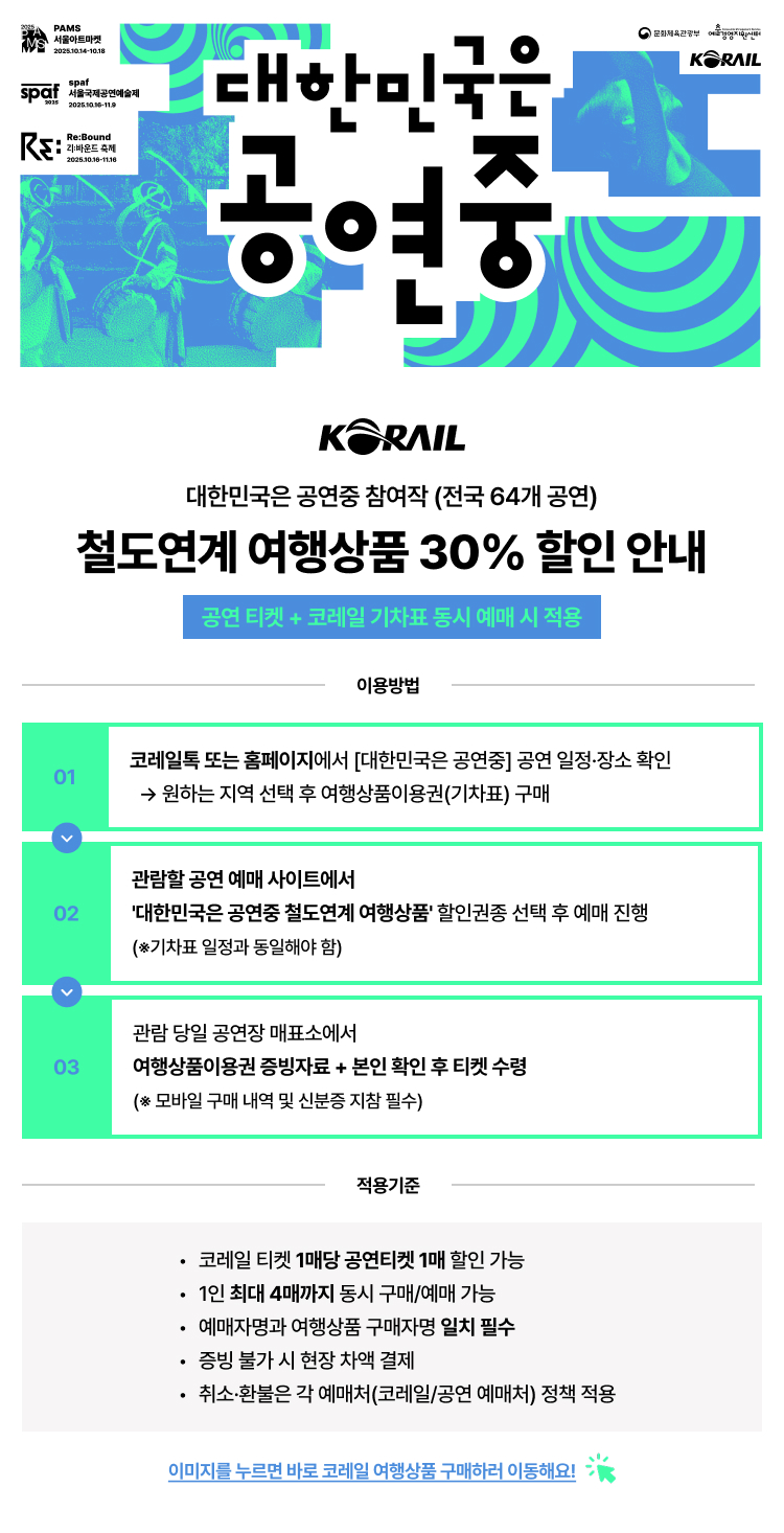 - 대한민국은 공연중 - 철도연계 여행상품 30% 4매 (여행상품 구매 화면 매표소에서 증빙 )