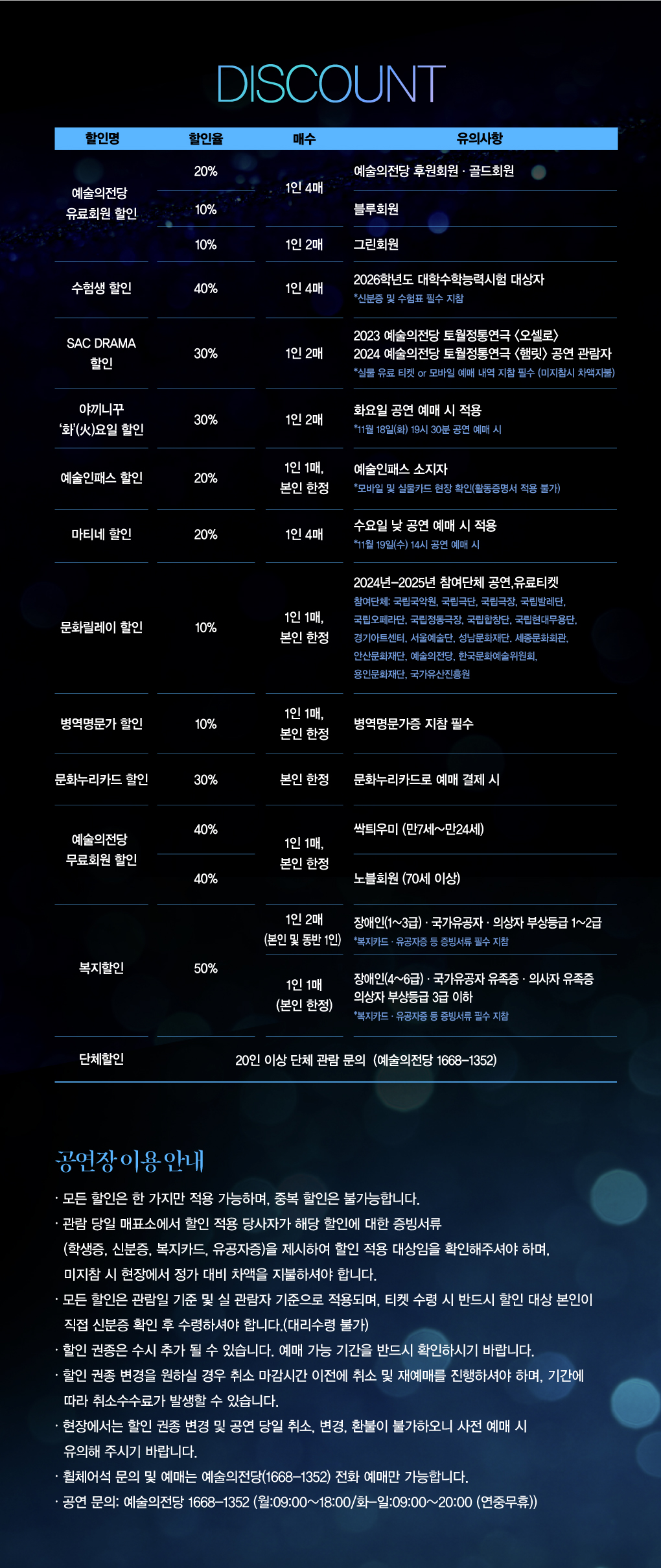 승용차 이용 시 주차장이 혼잡하여 공연장 정시 입장이 어려울 수 있으니, 대중교통을 이용해 주시기 바랍니다.