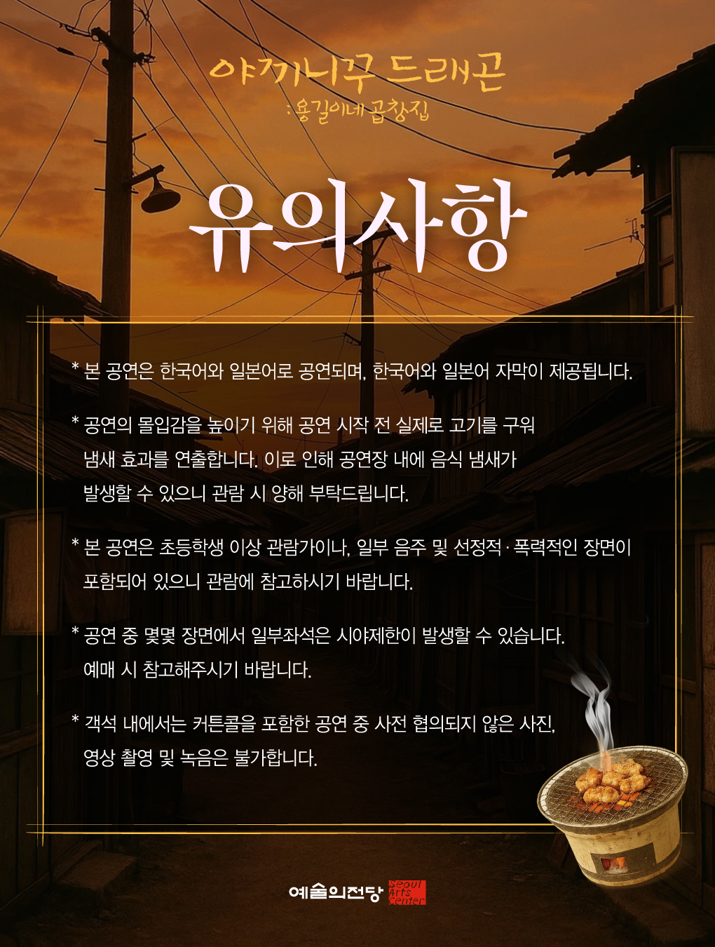 작품의 배경은 1970년대 일본 간사이 지방의 스러져 가는 조선인 부락의 한 켠 <야끼니꾸 드래곤: 용길이네 곱창집>이다. 막이 열리면 무대는 이미 곱창 굽는 냄새와 연기로 그득하다. 태평양 전쟁에서 팔 한 쪽을 잃은 김용길은 두 딸과 함께 일본에 정착해 지금의 부인과 만나 살고 있다. 봄, 여름, 가을, 겨울, 다시 벚꽃 흩날리는 봄이 오지만 빈곤과 차별의 그늘 아래 고단한 일상 속에서도, 때론 눈물겹게, 때론 경쾌하게 펼쳐지는 용길이네 가족의 감동 스토리가 2025년 한일수교 60주년을 기념하는 특별 연극으로 다시 한 번 일본 신국립극장과 예술의전당 CJ 토월극장 무대에 올라간다.