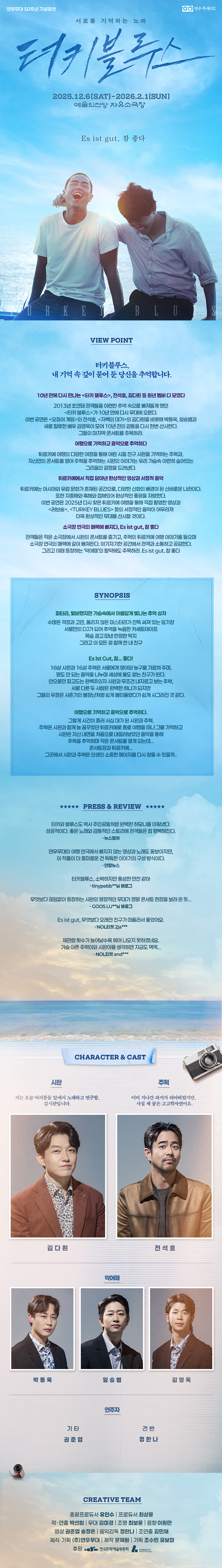 2013년 초연돼 관객들을 아련한 추억 속으로 빠져들게 했던 <터키 블루스>가 10년 만에 다시 무대에 오른다. 이번 공연은 <오징어 게임>의 전석호를 비롯해 김다흰, 박동욱, 임승범 등 원년 배우와 스태프가 그대로 모여 10년 전의 감동을 다시 한번 선사한다. 그들의 마지막 콘서트를 주목하라.