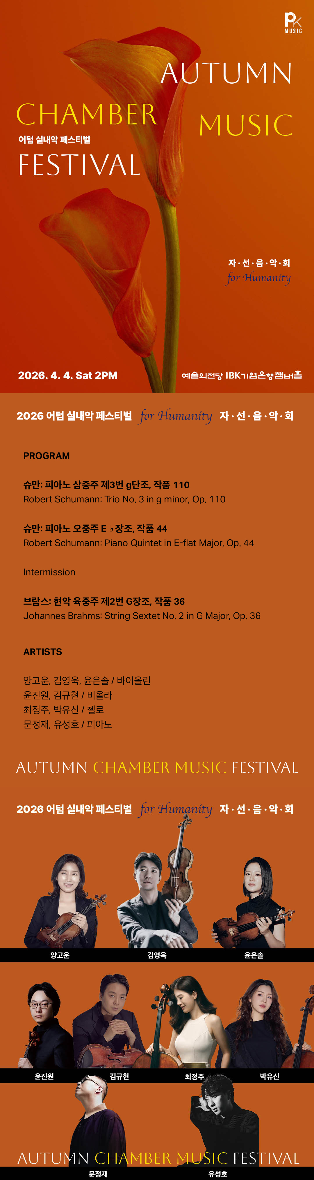 올해 8회를 맞이한 어텀 실내악 페스티벌은 실내악의 본질에 집중한 깊이 있는 프로그램으로 레퍼토리의 확장과 음악의 의미를 꾸준히 탐색해 왔다. 이번 공연은 특별 자선음악회로, 음악의 따뜻한 울림을 사회와 나누고자 기획되었으며 공연 수익 전액을 사회적 취약계층과 문화 소외지역을 위한 예술 나눔에 활용할 예정이다. 슈만의 피아노 삼중주와 피아노 오중주, 브람스의 현악 육중주로 구성된 이번 무대는 봄의 설렘과 성숙한 감정을 담아 실내악의 깊이와 따뜻한 감동을 전한다.