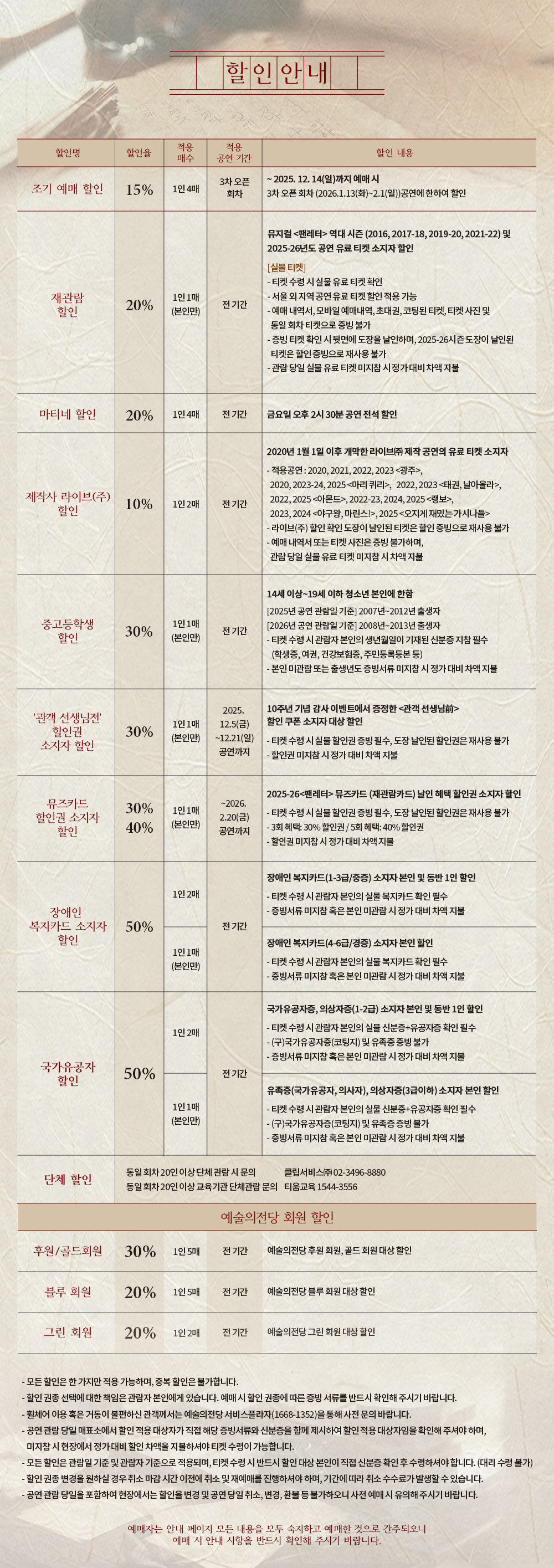 - 중/고등학생 할인 30% 1매 (14세 이상~19세 이하 청소년 본인에 한함 [2025년 공연 관람일 기준] 2007년~2012년 출생자 [2026년 공연 관람일 기준] 2008년~2013년 출생자 - 티켓 수령 시 본인의 생년월일이 기재된 신분증 지참 필수 (학생증, 여권, 건강보험증, 주민등록등본 등) - 본인 미관람 또는 출생년도 증빙서류 미지참 시 정가 대비 차액 지불)
