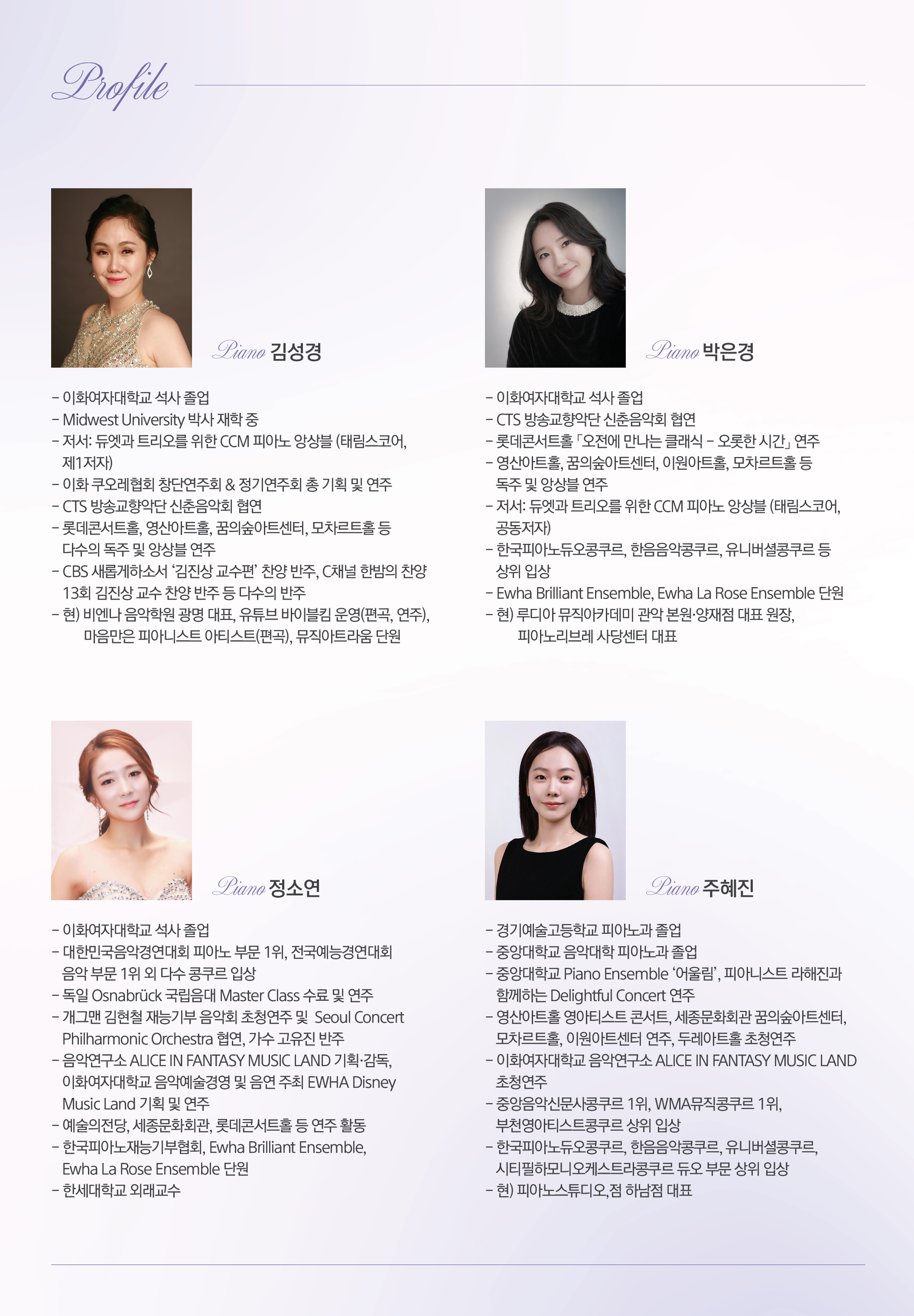- 예술의전당, 세종문화회관, 롯데콘서트홀, 금호아트홀 연세 등 활발한 연주 활동