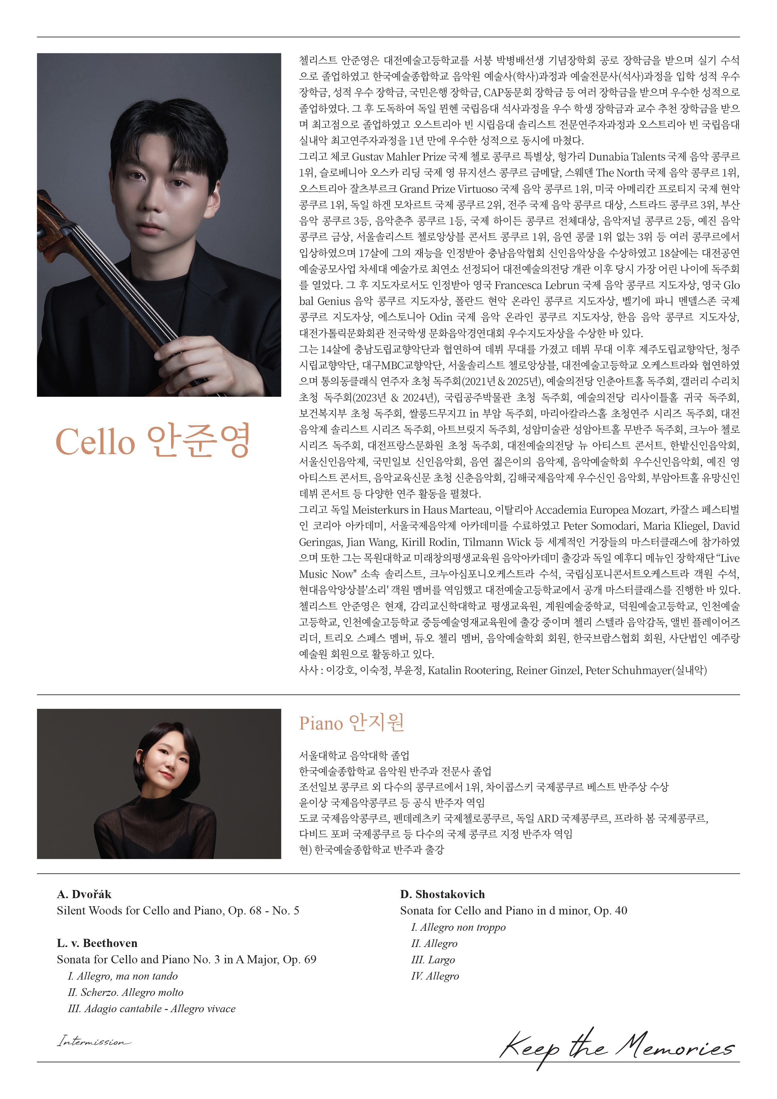 첼리스트 안준영은 대전예술고등학교를 서붕 박병배선생 기념장학회 공로 장학금을 받으며 실기 수석으로 졸업하였고 한국예술종합학교 음악원 예술사(학사)과정과 예술전문사(석사)과정을 입학 성적 우수 장학금, 성적 우수 장학금, 국민은행 장학금, CAP동문회 장학금 등 여러 장학금을 받으며 우수한 성적으로 졸업하였다. 그 후 도독하여 독일 뮌헨 국립음대 석사과정을 우수 학생 장학금과 교수 추천 장학금을 받으며 최고점으로 졸업하였고 오스트리아 빈 시립음대 솔리스트 전문연주자과정과 오스트리아 빈 국립음대 실내악 최고연주자과정을 1년 만에 우수한 성적으로 동시에 마쳤다.