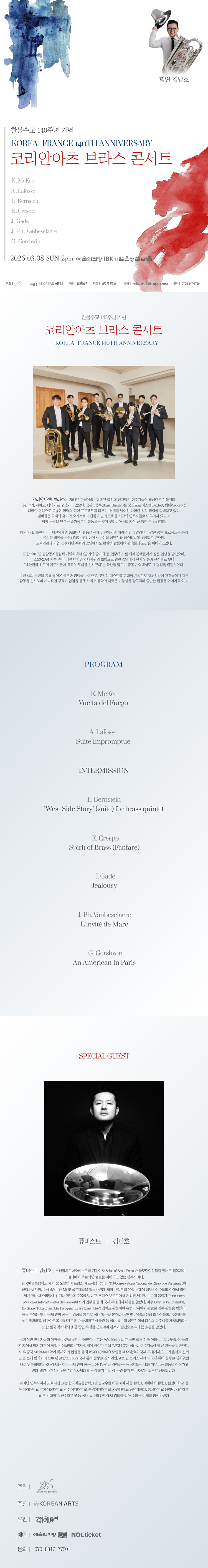한불 수교 140주년을 맞이하여 개최되는 코리안아츠 브라스의 공연은 프랑스의 음악을 코리안아츠 브라스가 가진 독보적인 음악적 색깔로 선사하며 한불 수교 140주년 기념을 축하하기 위해 기획된 공연입니다.