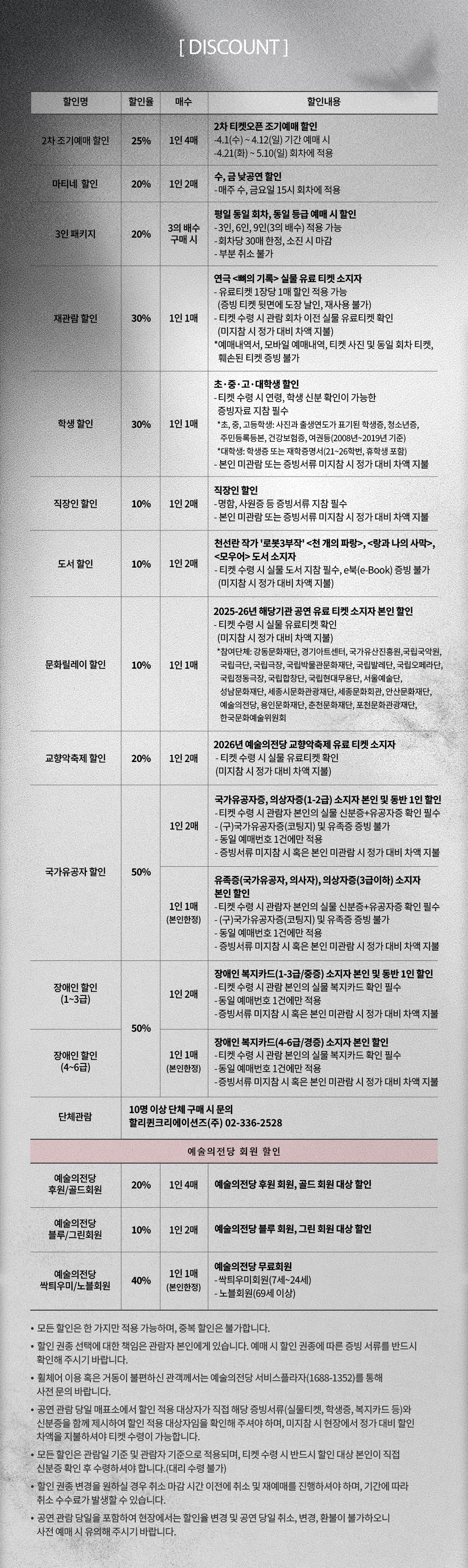 - 문화릴레이 할인 10% 1매 (1인 1매 / 2025년-2026년 공연 유료티켓 소지자 / 참여단체 : 강동문화재단, 경기아트센터, 국가유산진흥원,국립국악원, 국립극단, 국립극장, 국립박물관문화재단, 국립발레단, 국립오페라단, 국립정동극장, 국립합창단, 국립현대무용단, 서울예술단, 성남문화재단, 세종시문화관광재단, 세종문화회관, 안산문화재단, 예술의전당, 용인문화재단, 춘천문화재단, 포천문화관광재단, 한국문화예술위원회)