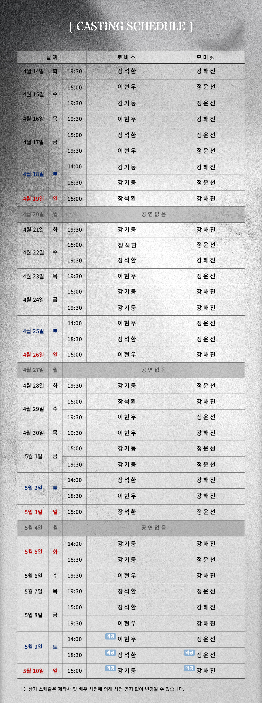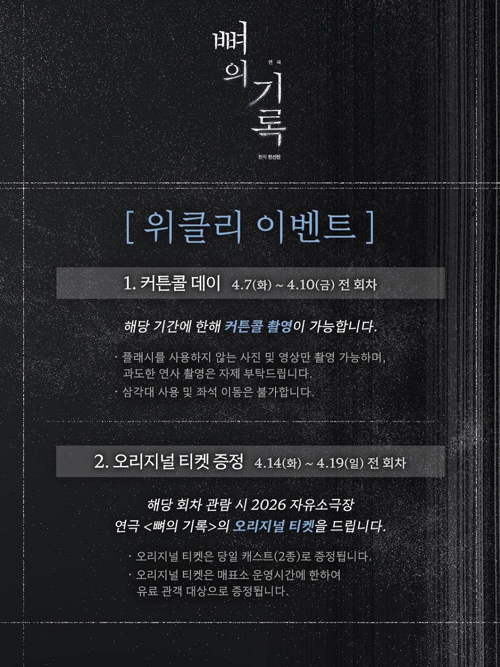 - 2차 조기예매 25% 4매 (4.1(수)~4.12(일) 기간 예매 시, 4.21(화)~5.10(일)회차에 적용)