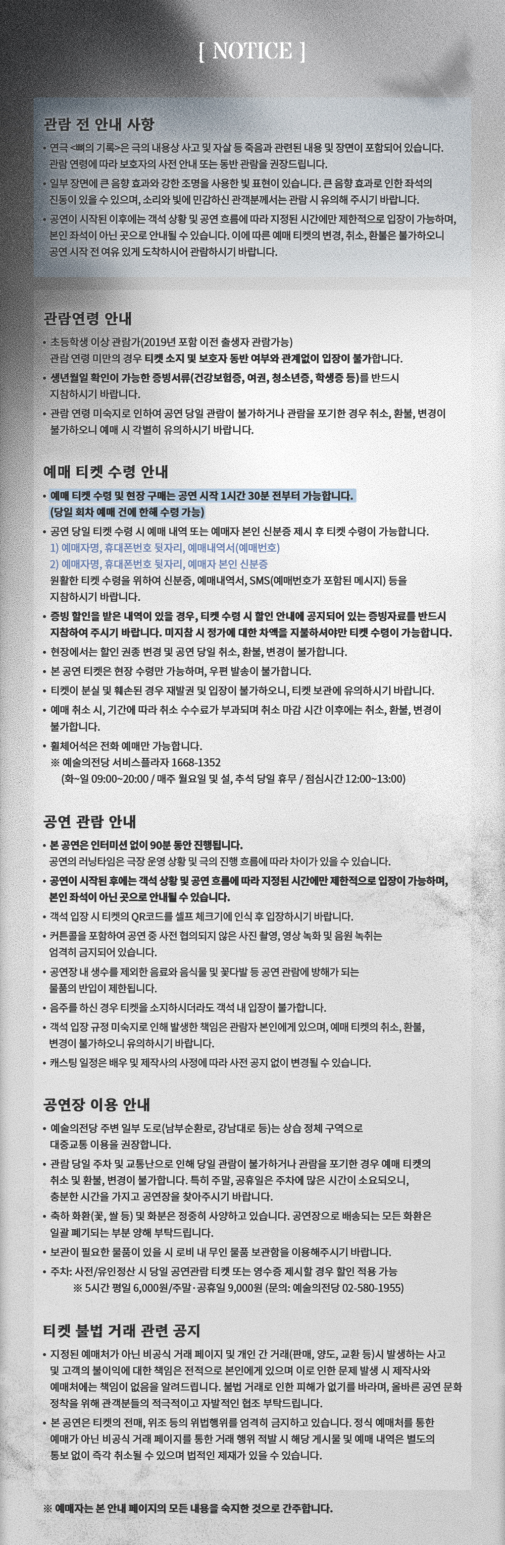 ※ 현장에서 티켓 수령 시 할인에 해당하는 증빙자료(학생증, 신분증, 복지카드, 유공자증 등)를 제시하지 못할경우 차액 지불 후 공연 관람 가능