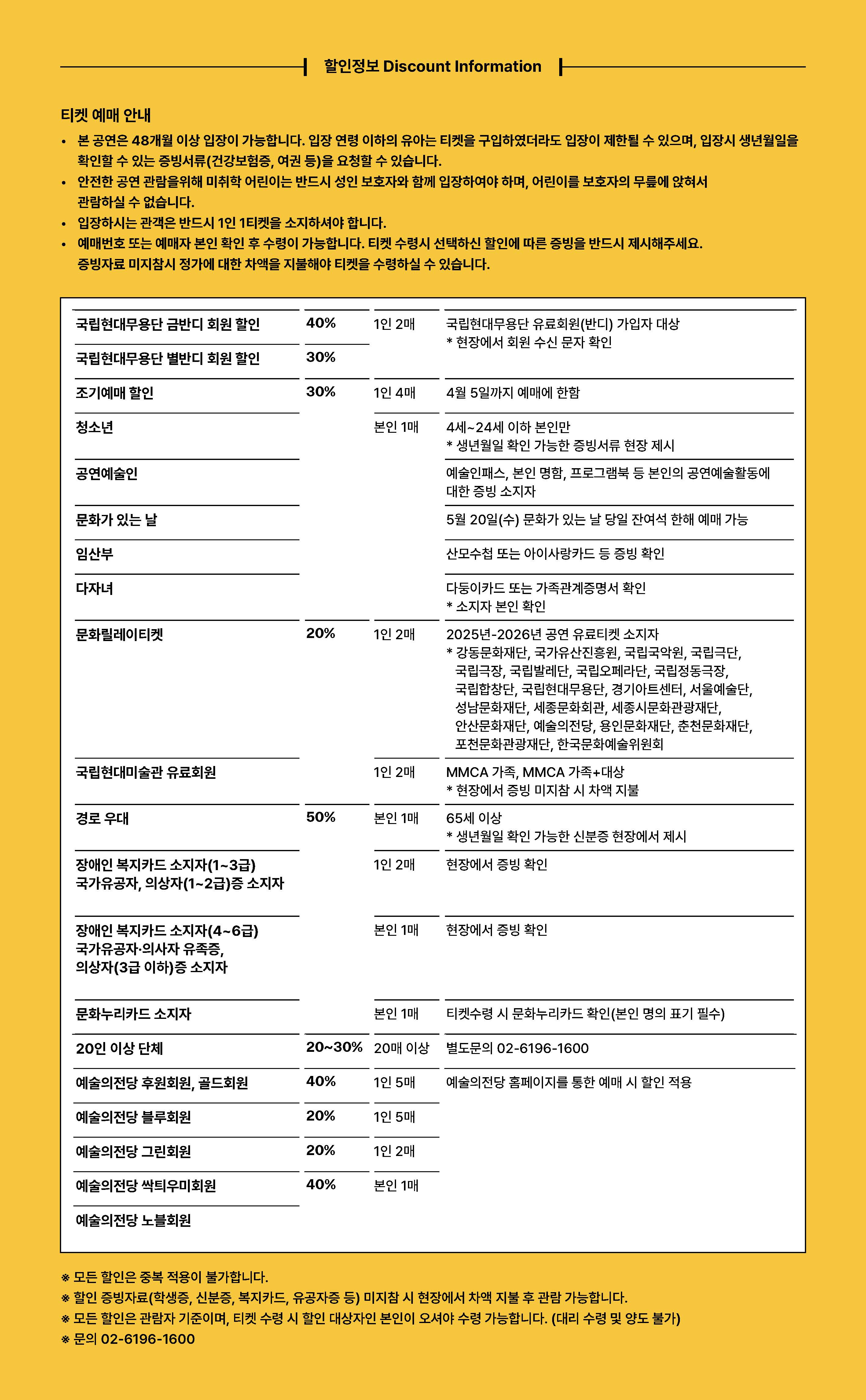 - 문화릴레이 할인 20% 2매 (1인 2매 / 2025년-2026년 공연 유료티켓 소지자 / 참여단체 : 강동문화재단, 국가유산진흥원, 국립국악원, 국립극단, 국립극장, 국립발레단, 국립오페라단, 국립정동극장, 국립합창단, 국립현대무용단, 경기아트센터, 서울예술단, 성남문화재단. 세종문화회관, 세종시문화관광재단, 안산문화재단, 예술의전당, 용인문화재단, 춘천문화재단, 포천문화관광재단, 한국문화예술위원회)