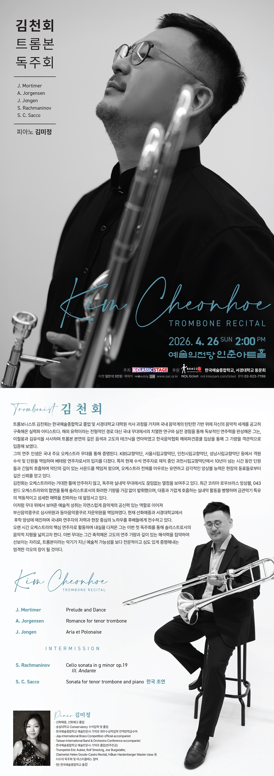 오랜 시간 오케스트라의 핵심 연주자로 활동하며 내실을 다져온 그는 이번 첫 독주회를 통해 솔리스트로서의 음악적 지평을 넓히고자 한다. 이번 무대는 그간 축적해온 고도의 연주 기량과 깊이 있는 해석력을 집약하여 선보이는 자리로, 트롬본이라는 악기가 지닌 예술적 가능성을 보다 전문적이고 심도 있게 증명해내는 엄격한 각오의 장이 될 것이다.